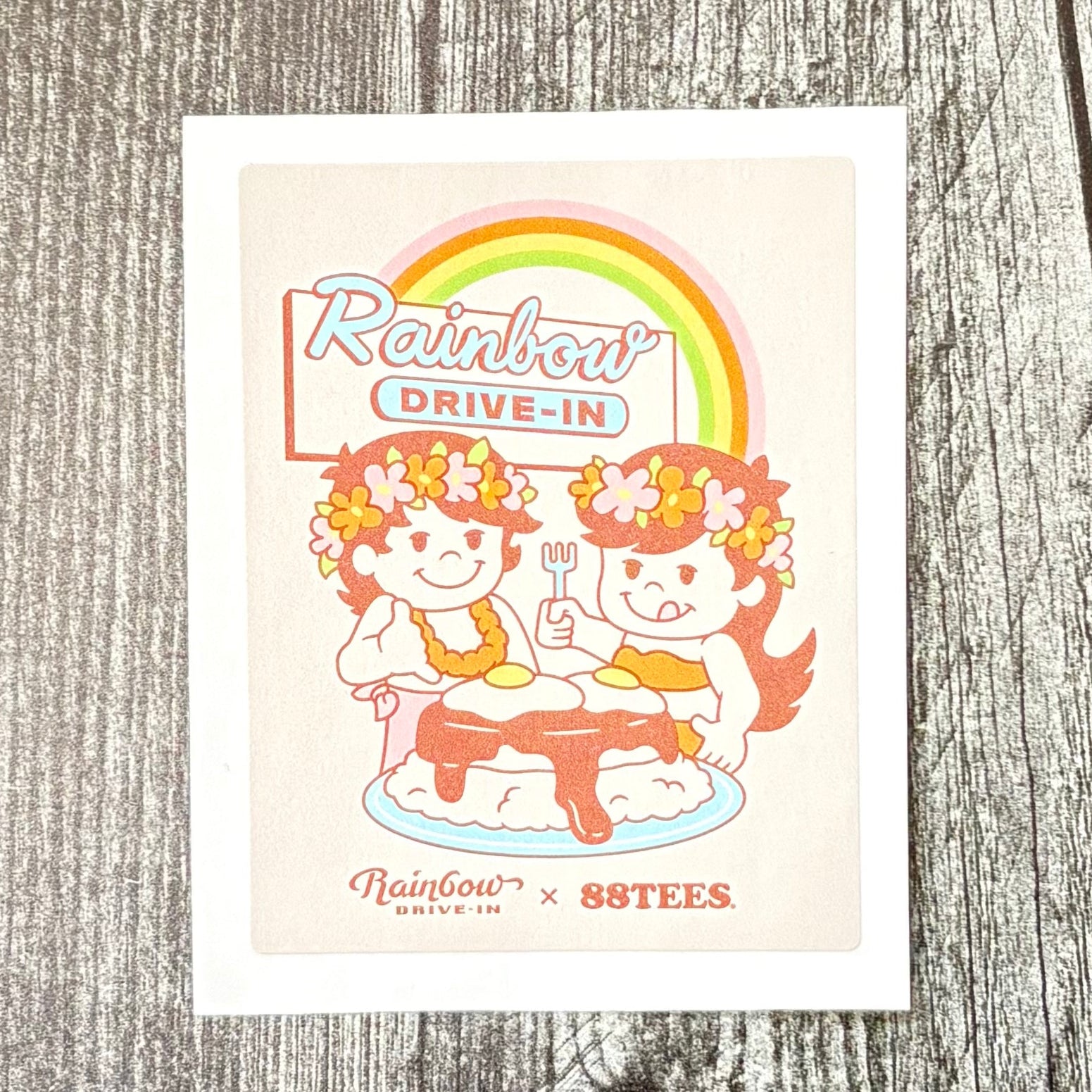 Yaya and Kuku are serving up local vibes! This fun collab sticker brings together 88 Tees and Rainbow Drive-In, featuring a classic loco moco plate lunch. Perfect for your water bottle, laptop, or anywhere you want to rep good food, good vibes, and island style.